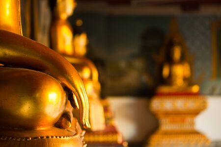 Close focus on hand of meditating monk statue in the row of many statues inside brick temple called Wat Yai Chai Mongkol in Ayutthaya of Thailand