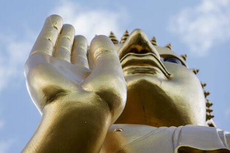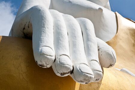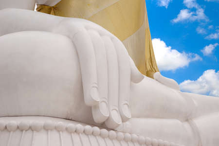 The hand of the white Buddha sky blue background. Buddha statue of Buddha of Buddhism, born in India.
