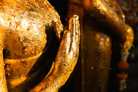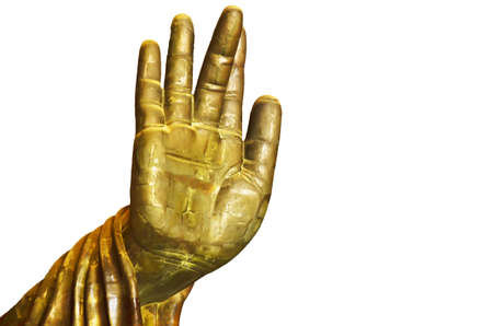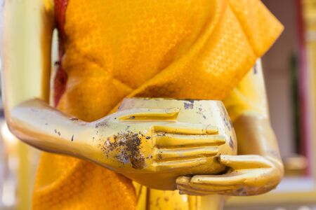 Close up hand filled with gold leaf of statue Buddha. concept shows the devotion of the Buddhists.