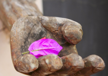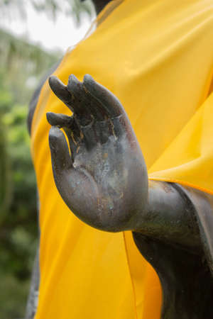 Aged time-worn hand of bronze Buddha statue in the temple.