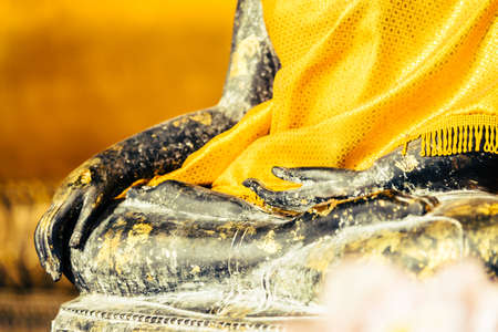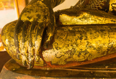 Right Hand of Old Gold Buddha statue sit cross legged.