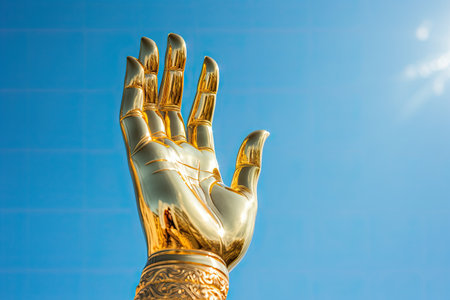 hand of golden buddha statue holding alms bowl in buddhist asian temple