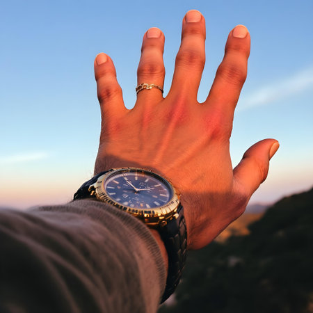 man's hand on which is dressed the clock shows a finger on the sky