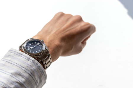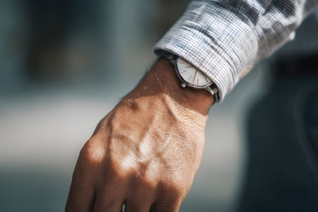Close up of man's hand with wristwatch on blurred background.