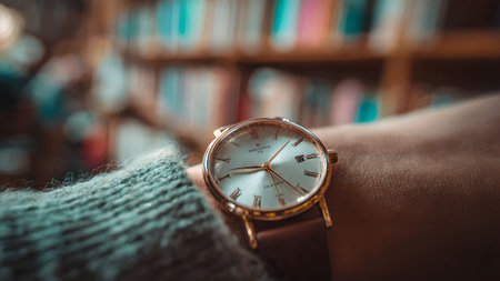 Close-up of a stylish wristwatch on a person's wrist, with a blurred background of books, creating a sophisticated and timeless image.
