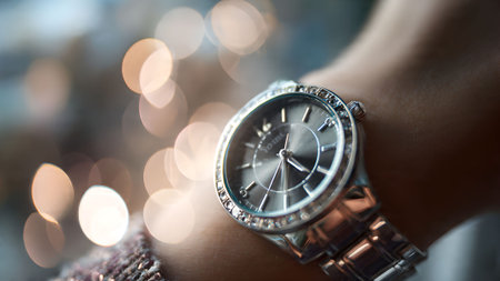 Close-up of a woman's wrist wearing a stylish silver wristwatch adorned with sparkling diamonds, set against a bokeh background.