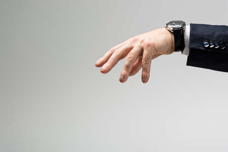 Man's hand in the suit pointing on his watch on a gray background