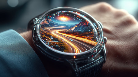 A stunning wristwatch features a miniature landscape, capturing a glowing highway winding through a dazzling city and majestic mountains at twilight. The intricate design merges nature and technology, creating a captivating visual experience.