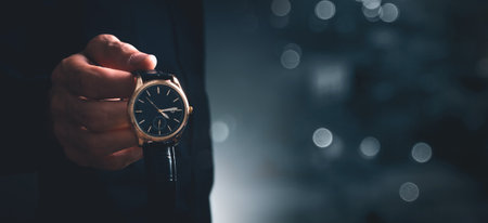 Black and white product photography of a luxury man wrist watch showing time with man hand close up