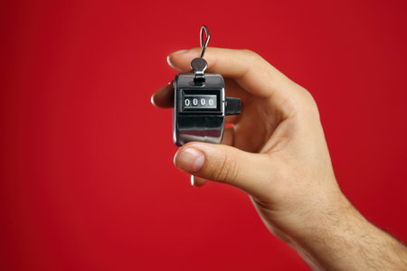 Man modern digital timer on red background, closeup