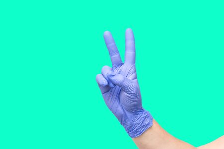 male hand on mint background showing the symbol of victory or number two or sexual insult