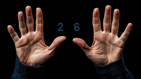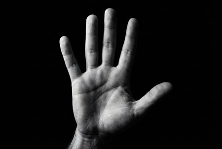 A striking black and white photograph capturing the intricate details of an open human hand, fingers splayed, set against a deep, contrasting black background, emphasizing texture and form.