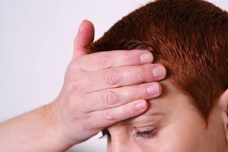 The woman put her hand to her forehead, experiencing a headache. Migraine, fever, blood pressure. Symptom of disease
