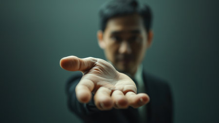 A close-up shot of a man's open hand with the palm facing upwards, set against a soft, vignetted background. The gesture can symbolize asking, receiving, giving, charity, or openness. The lighting is focused on the palm, highlighting the lines and skin texture.