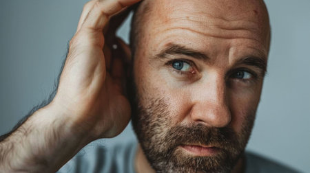 Middleaged bald man posing with head tilted to the side and hand on ear, looking directly at camera