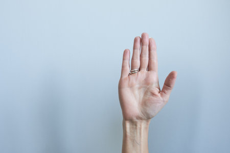 Woman hand showing stop gesture on gray background. Focus on hand.