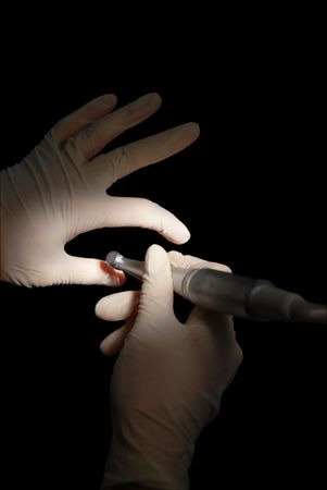 Abstract composition: dentist`s hands in rubber gloves turbine holding, over black. Treatment imitating