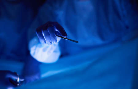 Surgeon hand holding surgical scalpel while operating patient in surgical theatre closeup. Resuscitation medicine team holding steel medical tools saving patient. Surgery and emergency concept
