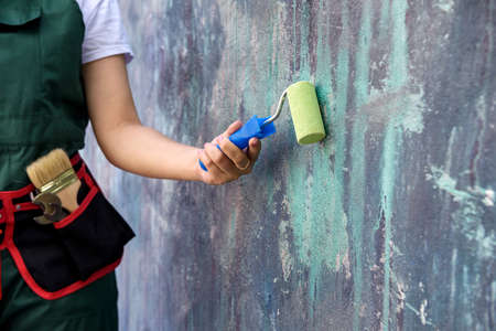 Worker in coverall painting wall with roller in green color close up