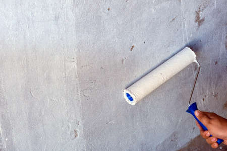 Hand with paint roller on background of empty concrete white wall. Repair.