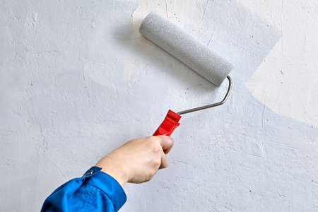 Paint roller in the hand of a man repainting the wall, painting work.