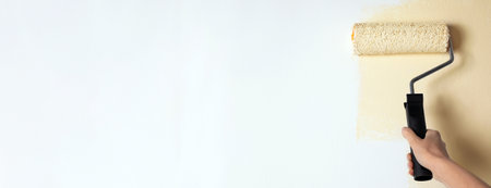 Professional decorator painting white wall with beige dye, space for text. Banner design