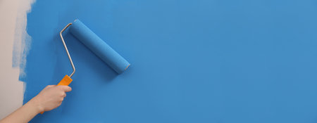 Hand painting wall with paint roller, pastel color. Appartment renovation, repair, building and home concept. Copy space, banner. Tools for painting walls