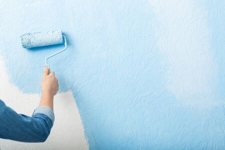 Paints texture wall with roller in blue, free space