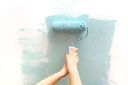Painting wall by aqua color paints with paint roll.