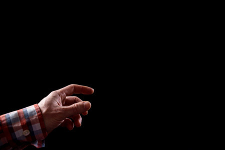 Male hand points Finger in a direction on a black isolated background. Concept of Hope and Support.