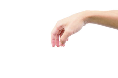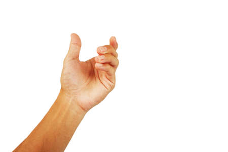 Male hand measuring or holding invisible item, mans palm making gesture while showing small amount of something on black isolated background
