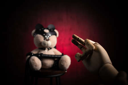 Concept of control. Marionette in human hand. Objects are colored on red and blue light.
