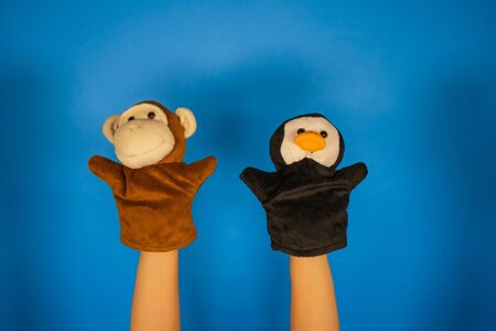 Puppet theater toys on a hand on a turquoise background. Childrens entertainment concept. Duck and panda
