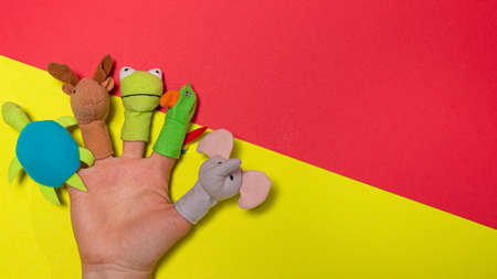 Fingers toys made of fabric on the hand on a yellow red background banner with a place for text. Fingers Theater