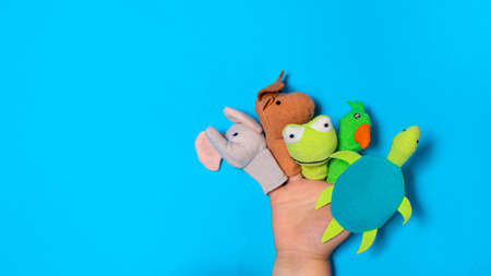 Small childrens hand and finger toys animals: elephant, deer, frog. parrot and turtle. Fingers Theatre