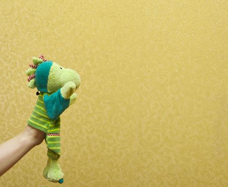 funny doll sock on yelow background, hand theater