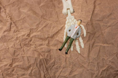 Skeleton hand pressing on figurine on red . Death concept
