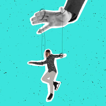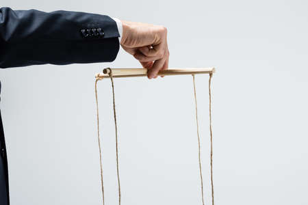 Puppeteer manipulating marionette with strings, control and manipulation concept
