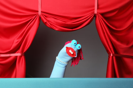 Creative puppet show on stage with red curtains