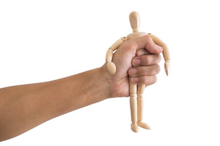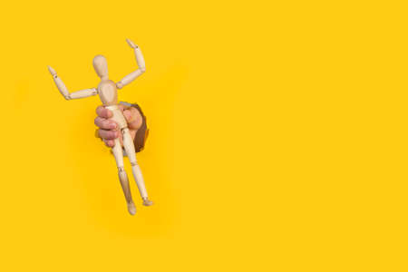 Concept of control. Marionette in human hand.