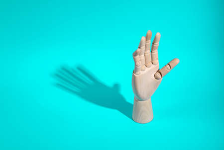 Wooden hand on a turquoise background with long shadow. minimal layout