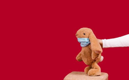 Hand holding pandemic Easter bunny toy wearing medical mask looking to empty space. COVID 19 holiday on red background. Concept for health, holidays during quarantine, celebration, restrictions.