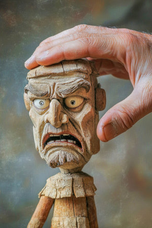 In the shadows, a powerful hand expertly pulls the strings, directing the every move of a wooden marionette.
