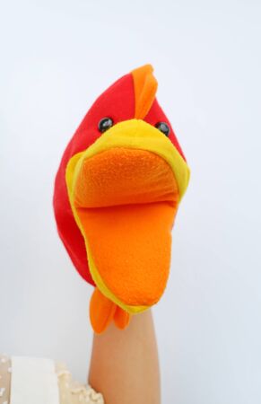 hand wearing children puppets, Chicken head