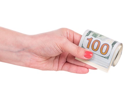 A female's hand holds a roll of money. Side view, close-up. White background. Copy space. Concept of world anti-corruption day, December 9.