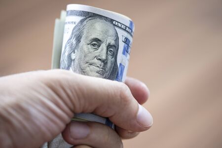 Male hand offering money - a roll of American dollars tied with yellow rubber band on the background of an old wooden table