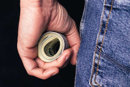 Person is hands holding dollars in hand on black isolated background. Bribery idea and corruption