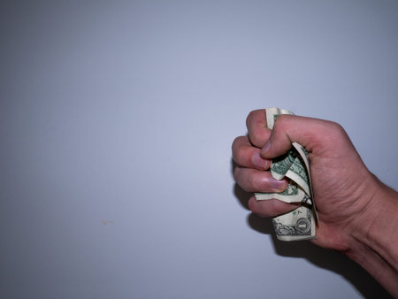 The hand holds and squeezes the dollars. Money in a fist. It's holding out dollars. First-person payment.