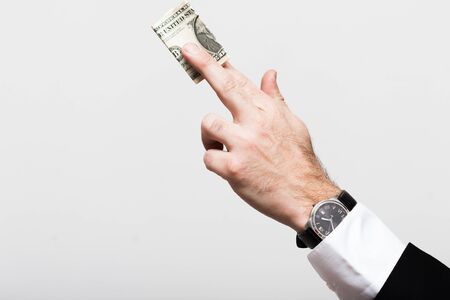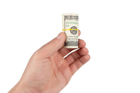 A man holds in his hand money in a roll tied with a band isolated on a white background. US dollar currency