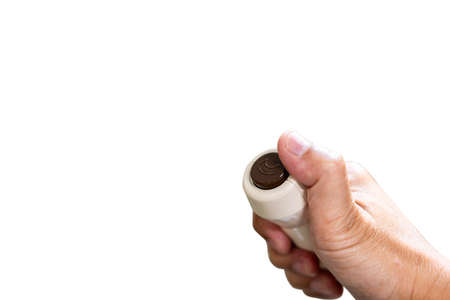 hand and button patient emergency calling for rescue nurse or doctor when have fever state in ward isolated on white back ground